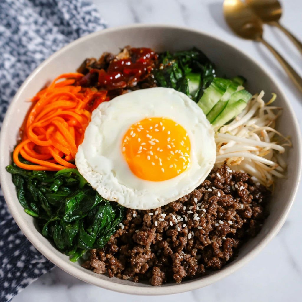 Place a scoop of warm rice in the center of a deep bowl. Arrange the seasoned vegetables and the Easy Bibimbap with Ground Beef in distinct sections around the perimeter. Top with the fried egg.