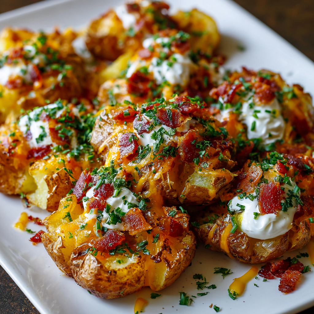 Boiled potatoes are smashed, roasted until golden and crunchy, then loaded with cheese, bacon, and toppings. Think of them as the perfect mix between roasted potatoes and loaded potato skins.