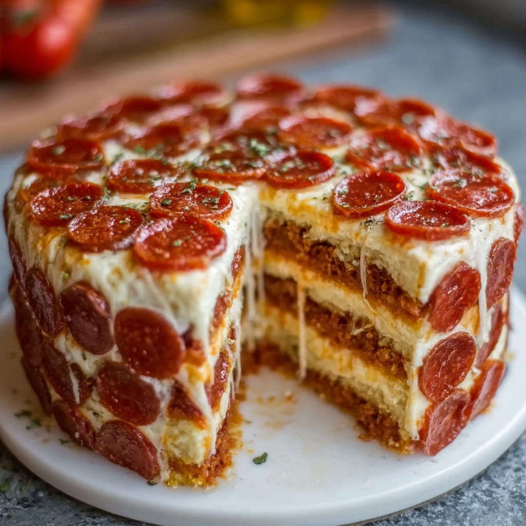 This Pepperoni Pizza Layer Cake turns traditional pizza into a tall, sliceable “cake” made of stacked pizza layers.
