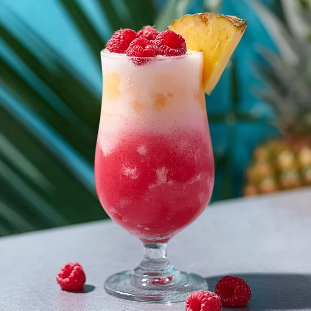 Traditional Piña Coladas rely on the creamy emulsion of Coconut Cream (fat) and Pineapple Juice (sugar/acid). Adding Raspberry introduces a powerful hit of ellagic acid and vibrant anthocyanins.