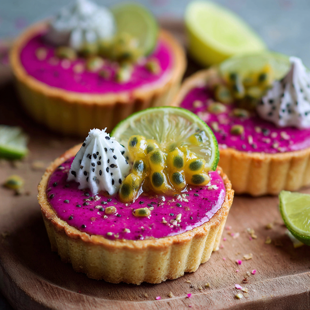 These Tropical Dragon Fruit & Lime Tarts are vibrant, refreshing mini desserts featuring a buttery tart shell, a creamy citrus-lime filling, and a naturally colorful dragon fruit topping. They look stunning, taste bright and zesty, and are perfect for summer gatherings or elegant dessert tables.