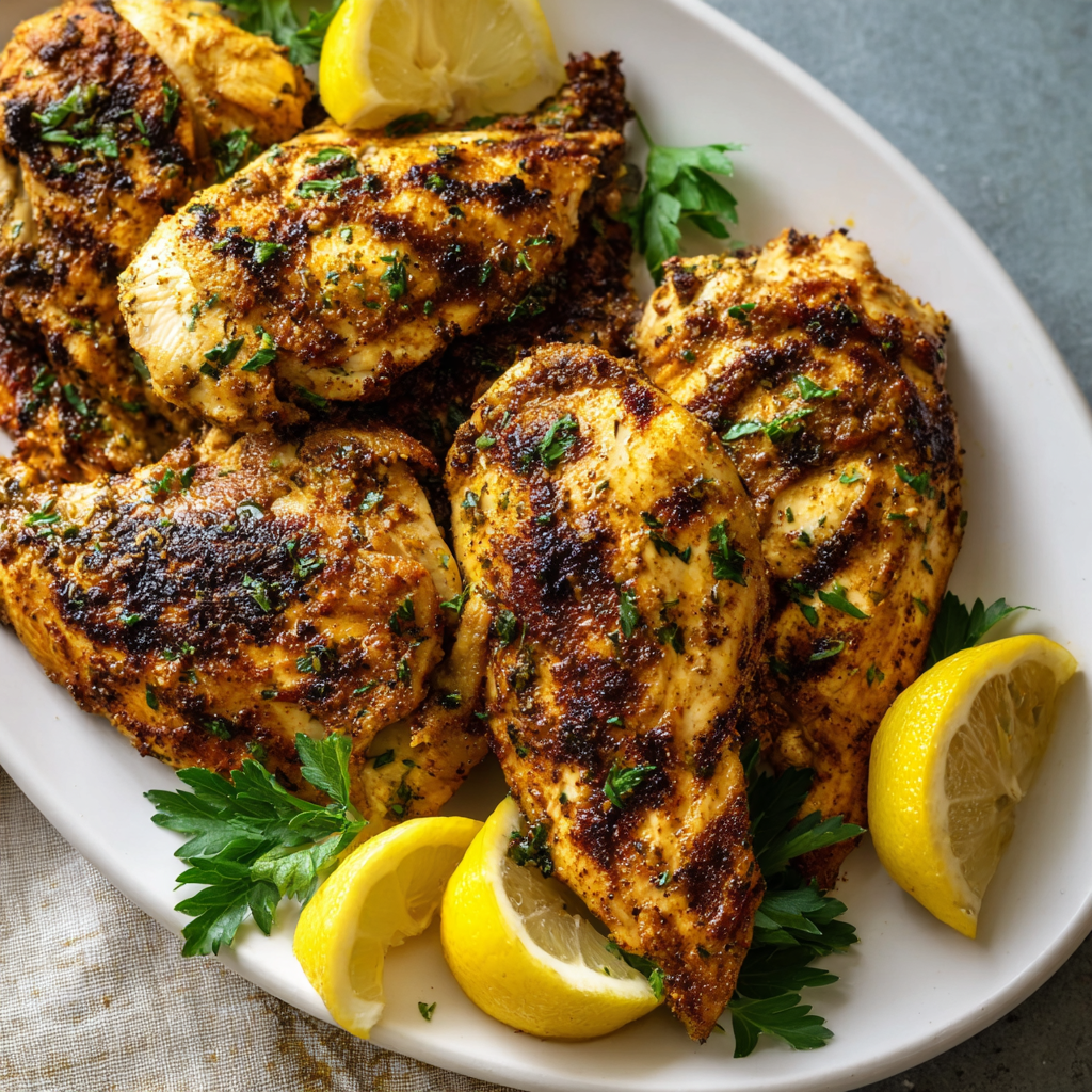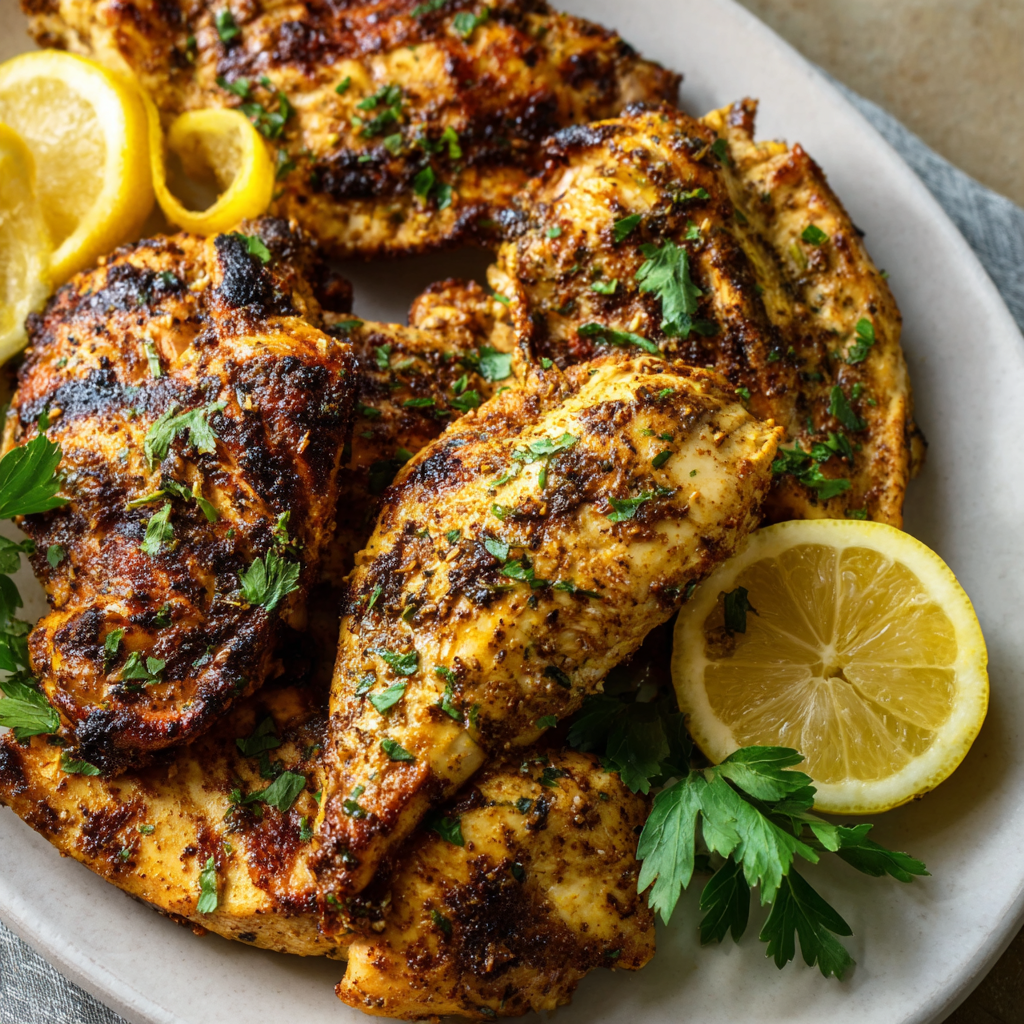 Transfer chicken to a platter and let it rest for 5 minutes. Garnish with fresh cilantro or parsley and lemon wedges.